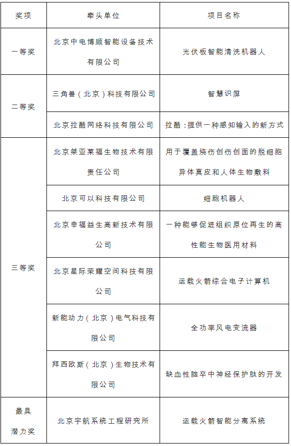 在24日上午的决赛上,十个参赛项目经过多个环节的努力和比拼,展现了团队风采和项目水平,分享了高价值专利培育的实践经验,诠释了敢于探索、敢于拼搏的创新精神。经过评委现场点评和打分,北京中电博顺智能设备技术有限公司凭借参赛项目“光伏板智能清扫机器人”斩获一等奖;三角兽(北京)科技有限公司和北京拉酷网络科技有限公司的参赛项目获得二等奖;北京幸福益生高新技术有限公司等6家单位的参赛项目荣获三等奖;北京宇航系统工程研究所获得最具潜力奖,北京清影机器视觉技术有限公司等19家单位获得优胜奖。